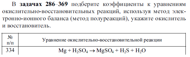 В задачах 286–369 подберите коэффициенты к уравнениям окислительно-восстановительных реакций, используя метод элек- тронно-ионного баланса (метод полуреакций), укажите окислитель и восстановитель..