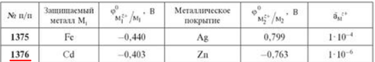 Задачи 1375-1386 (табл. 3.29). Рассчитайте ЭДС коррозионного элемента, работающего в нейтральной аэрированной среде при нарушении сплошности защитного покрытия (при известной относительной активности ионов корродирующего металла аМz+/М). Приведите уравнения электродных процессов. Укажите тип покрытия.