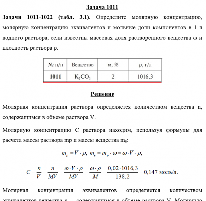 Задачи 1011-1022 (табл. 3.1). Определите молярную концентрацию, молярную концентрацию эквивалентов и мольные доли компонентов в 1 л водного раствора, если известны массовая доля растворенного вещества ω и плотность раствора ρ.