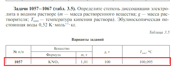 Задачи 1057-1067 (табл. 3.5). Определите степень диссоциации электролита в водном растворе (m — масса растворенного вещества; g — масса растворителя; Ткип — температура кипения раствора). Эбулиоскопическая постоянная воды 0,52 К·моль-1·кг..