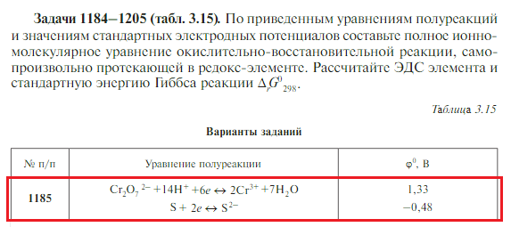 Задачи 1184-1205 (табл. 3.15). По приведенным уравнениям полуреакций и значениям стандартных электродных потенциалов составьте полное ионно-молекулярное уравнение окислительно-восстановительной реакции, самопроизвольно протекающей в редоксэлементе. Рассчитайте ЭДС элемента и стандартную энергию Гиббса реакции ΔrG0298