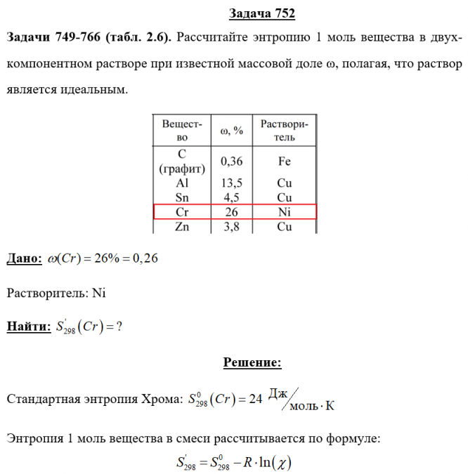 Задачи 749-766 (табл. 2.6). Рассчитайте энтропию 1 моль вещества в двух-компонентном растворе при известной массовой доле ω, полагая, что раствор является идеальным.