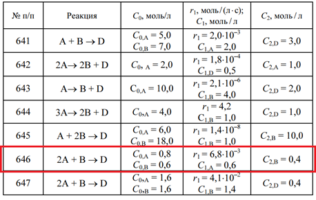 Задача 646 - для данной элементарной реакции рассчитайте скорость реакции r2 при указанной концентрации С2 одного из компонентов, если известны начальные концентрации реагентов С0 и скорость реакции r1 при определенной концентрации одного из компонен