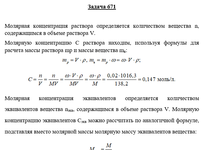 Задача 671 - определите молярную концентрацию и молярную концентрацию эквивалента водного раствора, если известны массовая доля растворенного вещества ω и плотность раствора ρ.