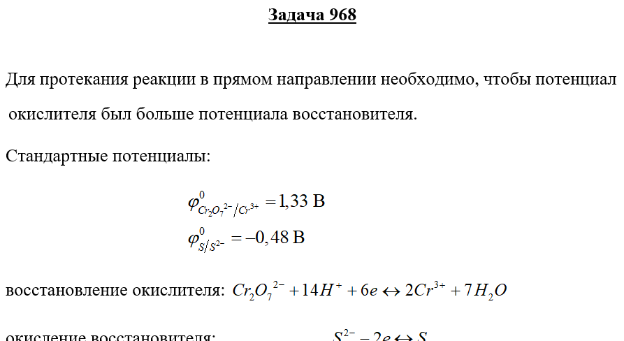 Для студентов по предмету ХимияЗадача 968 - по приведенным уравнениям полуреакций и значениям стандартных потенциалов составьте полное ионно-молекулярное уравнение окислительно-воссЗадача 968 - по приведенным уравнениям полуреакций и значениям стандартных потенциалов составьте полное ионно-молекулярное уравнение окислительно-восс