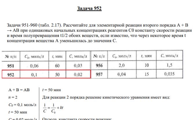 Главная » Учебные материалы » Химия » Решения задач » Несколько классов/семестров » Номер 952 » Рассчитайте для элементарной реакции второго порядка А + В → АВ при одинаковых начальных концентрациях реагентов С0 константу скорости реакции и время полупревращения t1/2 обоих веществ, если известно, что через некоторое время t концентрация веществ