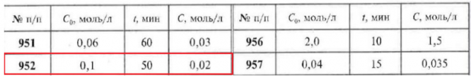 Задачи 951-960 (табл. 2.17). Рассчитайте для элементарной реакции второго порядка А + В → АВ при одинаковых начальных концентрациях реагентов С0 константу скорости реакции и время полупревращения t1/2 обоих веществ, если известно, что через некоторое время t концентрация вещества А уменьшилась до значения С.