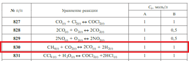 Задачи 827-841 (табл. 2.10). Для данной гомогенной реакции А + В ↔ С + D определите температуру, при которой наступает равновесие. Напишите выражение константы равновесия. Рассчитайте равновесный состав системы при этой температуре, если известны начальные концентрации исходных веществ C0 (продукты реакции в исходной смеси отсутствуют)..
