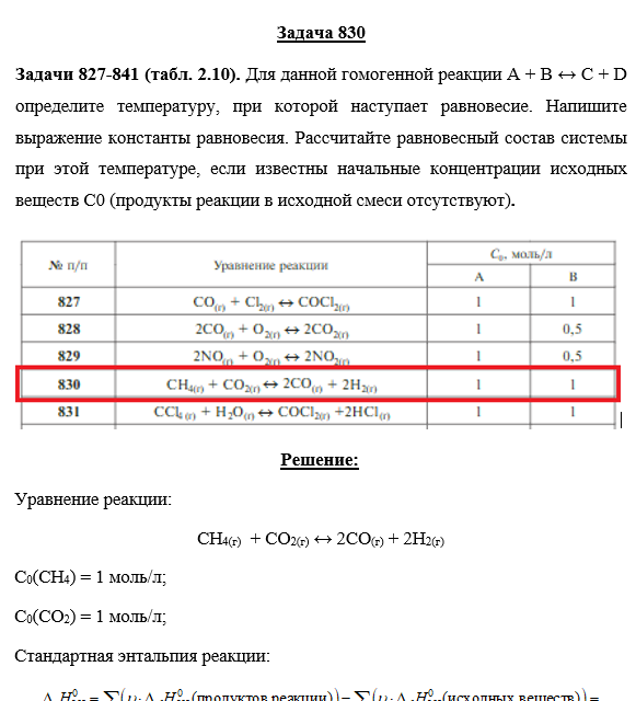 Задачи 827-841 (табл. 2.10). Для данной гомогенной реакции А + В ↔ С + D определите температуру, при которой наступает равновесие. Напишите выражение константы равновесия. Рассчитайте равновесный состав системы при этой температуре, если известны начальные концентрации исходных веществ C0 (продукты реакции в исходной смеси отсутствуют).