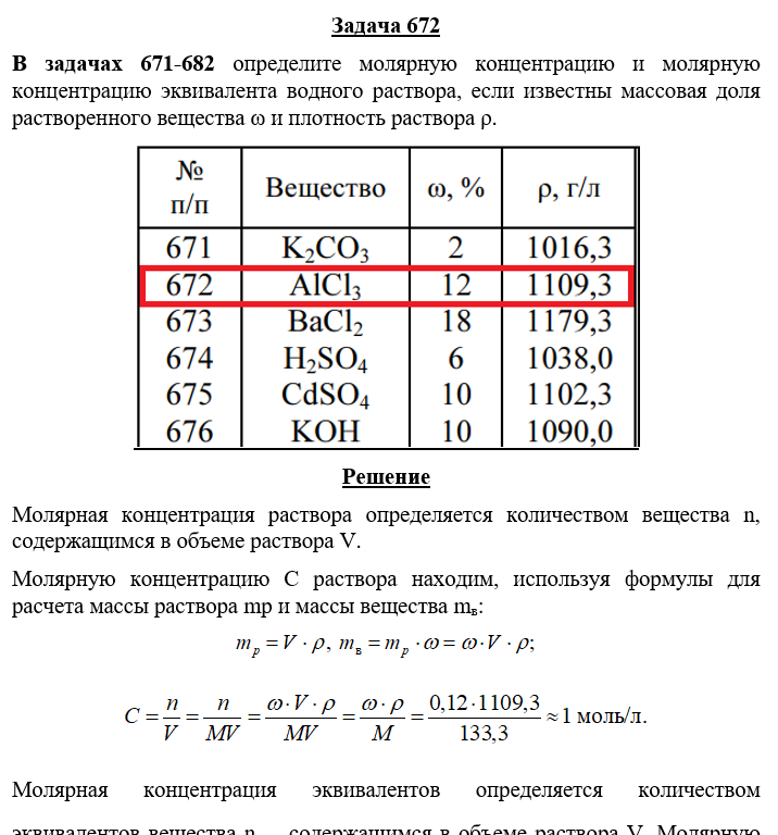 Задача 672 - определите молярную концентрацию и молярную концентрацию эквивалента водного раствора, если известны массовая доля растворенного вещества ω и плотность раствора ρ.
