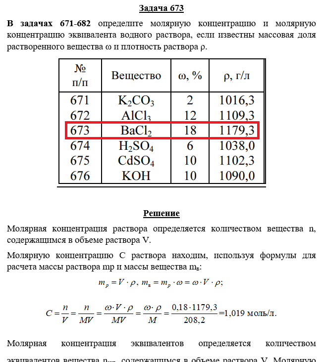 Задача 673 - определите молярную концентрацию и молярную концентрацию эквивалента водного раствора, если известны массовая доля растворенного вещества ω и плотность раствора ρ.
