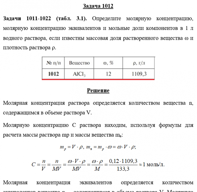 Задача 1012 - Определите молярную концентрацию, молярную концентрацию эквивалентов и мольные доли компонентов в 1 л водного раствора, если известны массовая доля растворенного вещества ω и плотность раствора ρ.