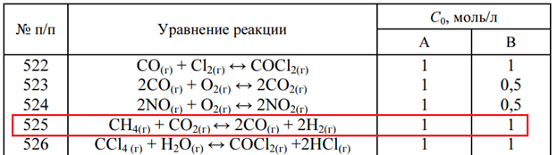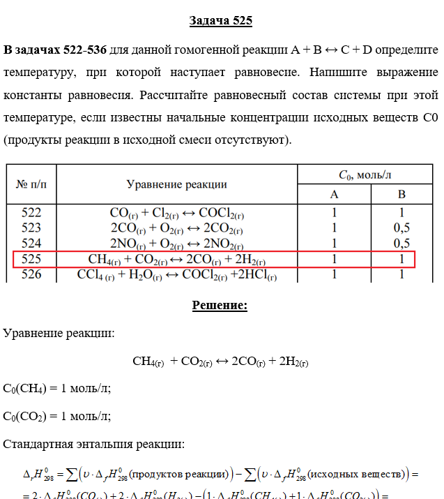 Задача 525 - для данной гомогенной реакции А + В ↔ С + D определите температуру, при которой наступает равновесие. Напишите выражение константы равновесия. Рассчитайте равновесный состав системы при этой температуре, если известны начальные концентра