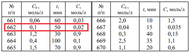 В задачах 661-670 рассчитайте для элементарной реакции второго порядка А + В → АВ при одинаковых начальных концентрациях реагентов С0 константу скорости реакции и время полупревращения t0,5, если известно, что через некоторое время t концентрация вещества А уменьшилась до значения С.
