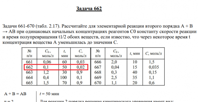 Задача 662 - рассчитайте для элементарной реакции второго порядка А + В → АВ при одинаковых начальных концентрациях реагентов С0 константу скорости реакции и время полупревращения t0,5, если известно, что через некоторое время t концентрация вещества