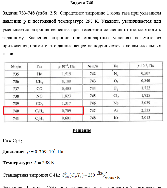 Задачи 733-748 (табл. 2.5). Определите энтропию 1 моль газа при указанном давлении p и постоянной температуре 298 К. Укажите, увеличивается или уменьшается энтропия вещества при изменении давления от стандартного к заданному. Значения энтропии при стандартных условиях возьмите из приложения; примите, что данные вещества подчиняются законам идеальных газов.