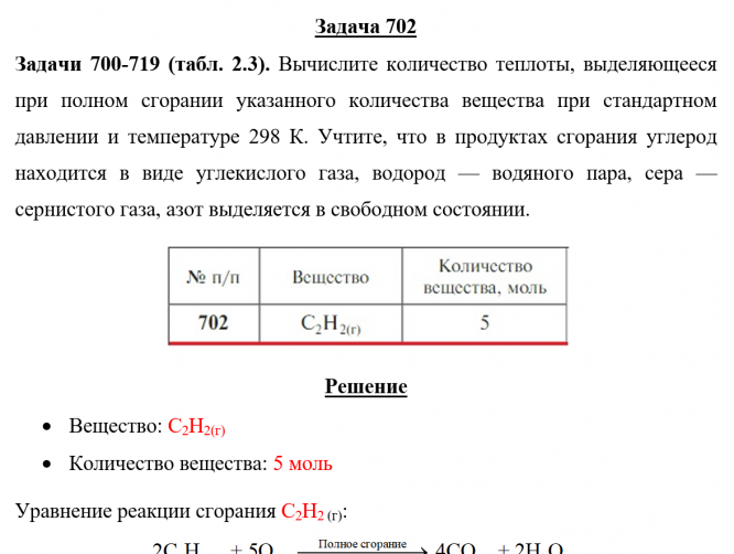 Задача 702 - Вычислите количество теплоты, выделяющееся при полном сгорании указанного количества вещества при стандартном давлении и температуре 298 К. Учтите, что в продуктах сгорания углерод находится в виде углекислого газа, водород — водяного па