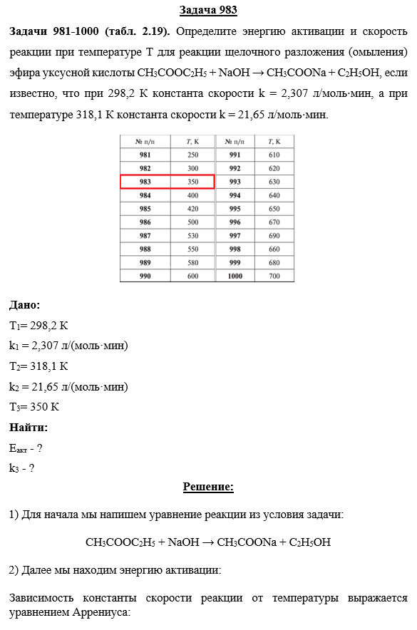 Задачи 981-1000 (табл. 2.19). Определите энергию активации и скорость реакции при температуре Т для реакции щелочного разложения (омыления) эфира уксусной кислоты СH3COOC2H5 + NaOH → СH3COONa + C2H5OH, если известно, что при 298,2 К константа скорости k = 2,307 л/моль⋅мин, а при температуре 318,1 К константа скорости k = 21,65 л/моль⋅мин.