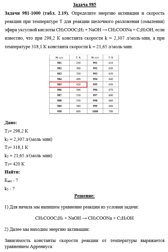 Задачи 981-1000 (табл. 2.19). Определите энергию активации и скорость реакции при температуре Т для реакции щелочного разложения (омыления) эфира уксусной кислоты СH3COOC2H5 + NaOH → СH3COONa + C2H5OH, если известно, что при 298,2 К константа скорости k = 2,307 л/моль⋅мин, а при температуре 318,1 К константа скорости k = 21,65 л/моль⋅мин.