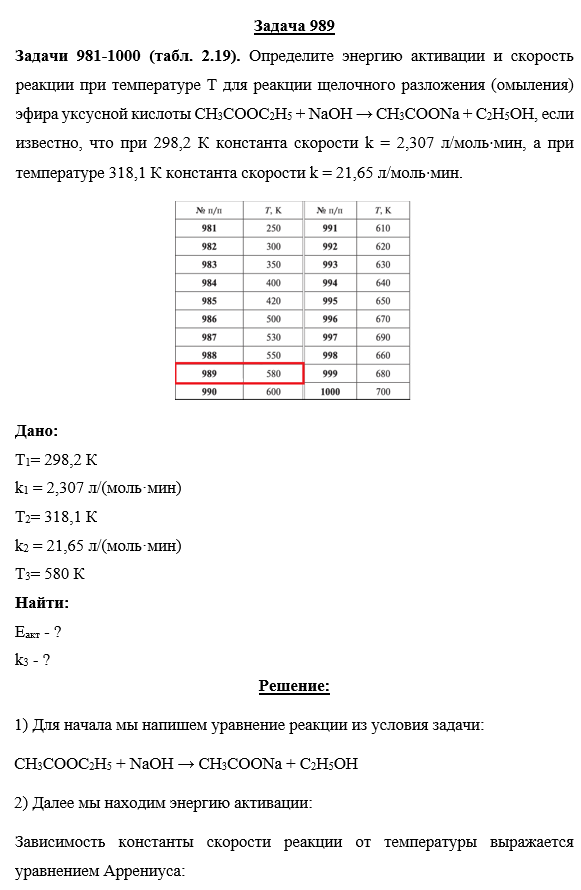 Задачи 981-1000 (табл. 2.19). Определите энергию активации и скорость реакции при температуре Т для реакции щелочного разложения (омыления) эфира уксусной кислоты СH3COOC2H5 + NaOH → СH3COONa + C2H5OH, если известно, что при 298,2 К константа скорости k = 2,307 л/моль⋅мин, а при температуре 318,1 К константа скорости k = 21,65 л/моль⋅мин.
