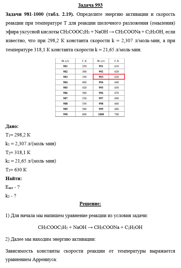 Задача 993 - Определите энергию активации и скорость реакции при температуре Т для реакции щелочного разложения (омыления) эфира уксусной кислоты СH3COOC2H5 + NaOH → СH3COONa + C2H5OH, если известно, что при 298,2 К константа скорости k = 2,307 л/мол