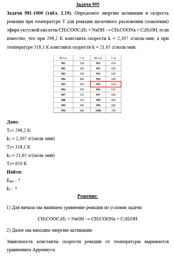Задачи 981-1000 (табл. 2.19). Определите энергию активации и скорость реакции при температуре Т для реакции щелочного разложения (омыления) эфира уксусной кислоты СH3COOC2H5 + NaOH → СH3COONa + C2H5OH, если известно, что при 298,2 К константа скорости k = 2,307 л/моль⋅мин, а при температуре 318,1 К константа скорости k = 21,65 л/моль⋅мин.