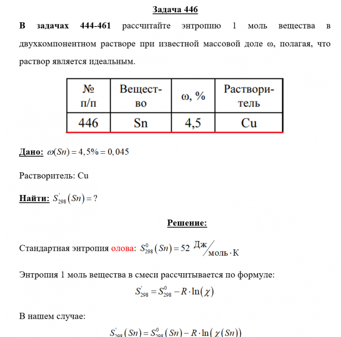 Для студентов по предмету ХимияЗадача 446 - рассчитайте энтропию 1 моль вещества в двухкомпонентном растворе при известной массовой доле ω, полагая, что раствор является идеальным.Задача 446 - рассчитайте энтропию 1 моль вещества в двухкомпонентном растворе при известной массовой доле ω, полагая, что раствор является идеальным.