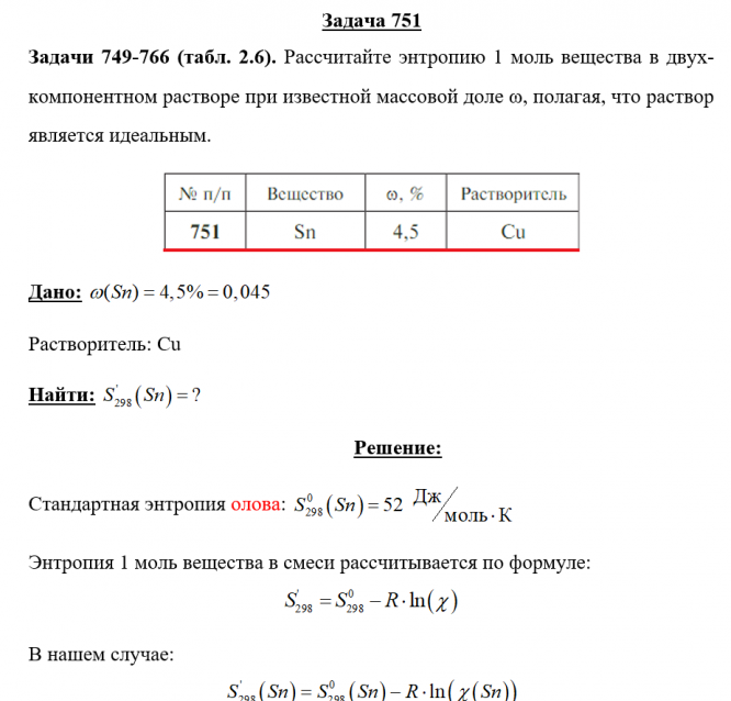 Задачи 749-766 (табл. 2.6). Рассчитайте энтропию 1 моль вещества в двух-компонентном растворе при известной массовой доле ω, полагая, что раствор является идеальным..