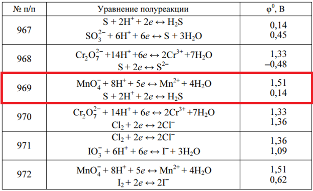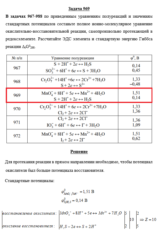 Задача 969 - по приведенным уравнениям полуреакций и значениям стандартных потенциалов составьте полное ионно-молекулярное уравнение окислительно-восстановительной реакции, самопроизвольно протекающей в редоксэлементе. Рассчитайте ЭДС элемента и стан