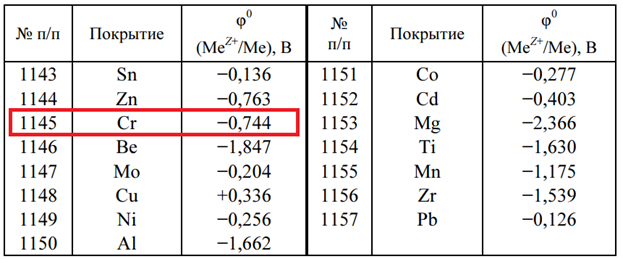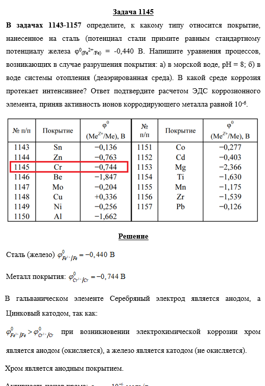 Задача 1145- определите, к какому типу относится покрытие, нанесенное на сталь (потенциал стали примите равным стандартному потенциалу железа φ0(Fe2+/Fe) = -0,440 В. Напишите уравнения процессов, возникающих в случае разрушения покрытия: а) в морской