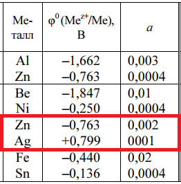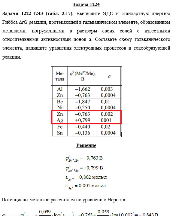Задача 1224 - Вычислите ЭДС и стандартную энергию Гиббса ΔrG реакции, протекающей в гальваническом элементе, образованном металлами, погруженными в растворы своих солей с известными относительными активностями ионов a. Составьте схему гальванического
