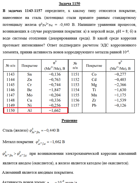 Для студентов по предмету ХимияЗадача 1150 - определите, к какому типу относится покрытие, нанесенное на сталь (потенциал стали примите равным стандартному потенциалу железа φ0(Fe2+Задача 1150 - определите, к какому типу относится покрытие, нанесенное на сталь (потенциал стали примите равным стандартному потенциалу железа φ0(Fe2+