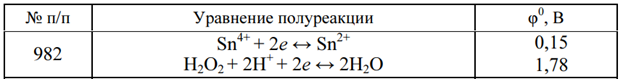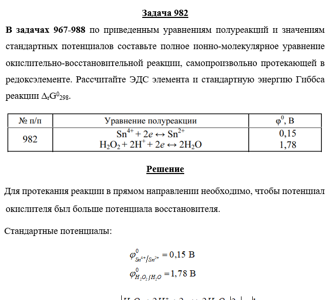 Задача 982 - по приведенным уравнениям полуреакций и значениям стандартных потенциалов составьте полное ионно-молекулярное уравнение окислительно-восстановительной реакции, самопроизвольно протекающей в редоксэлементе. Рассчитайте ЭДС элемента и стан
