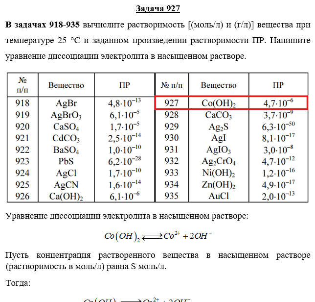 Для студентов по предмету ХимияЗадача 927 - вычислите растворимость [(моль/л) и (г/л)] вещества при температуре 25 °С и заданном произведении растворимости ПР. Напишите уравнение диЗадача 927 - вычислите растворимость [(моль/л) и (г/л)] вещества при температуре 25 °С и заданном произведении растворимости ПР. Напишите уравнение ди