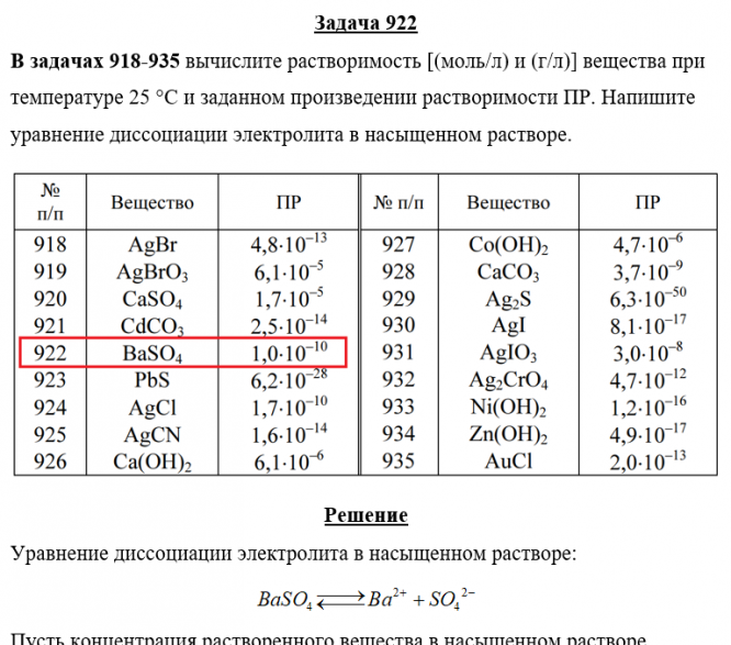 Задача 922 - вычислите растворимость [(моль/л) и (г/л)] вещества при температуре 25 °С и заданном произведении растворимости ПР. Напишите уравнение диссоциации электролита в насыщенном растворе.