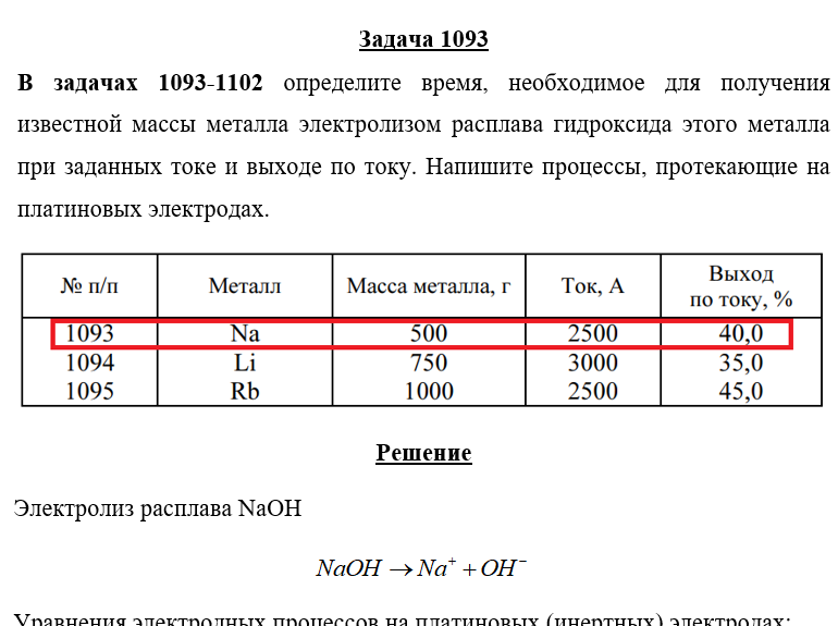 Для студентов по предмету ХимияЗадача 1093 - определите время, необходимое для получения известной массы металла электролизом расплава гидроксида этого металла при заданных токе и вЗадача 1093 - определите время, необходимое для получения известной массы металла электролизом расплава гидроксида этого металла при заданных токе и в