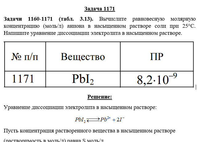Задача 1171 - Вычислите равновесную молярную концентрацию (моль/л) аниона в насыщенном растворе соли при 25°С. Напишите уравнение диссоциации электролита в насыщенном растворе.