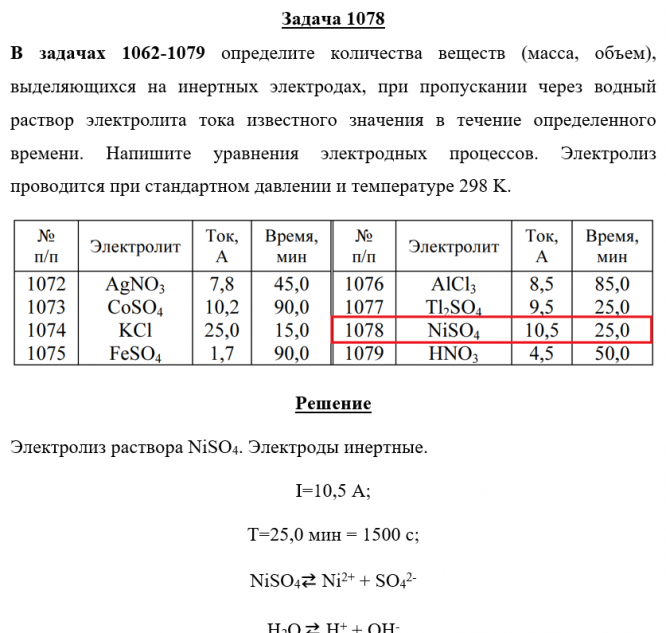 Задача 1078 - определите количества веществ (масса, объем), выделяющихся на инертных электродах, при пропускании через водный раствор электролита тока известного значения в течение определенного времени. Напишите уравнения электродных процессов. Элек