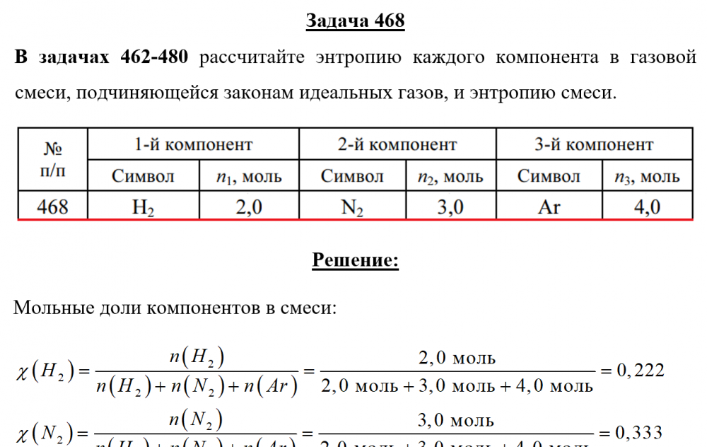 Задача 468 - рассчитайте энтропию каждого компонента в газовой смеси, подчиняющейся законам идеальных газов, и энтропию смеси.
