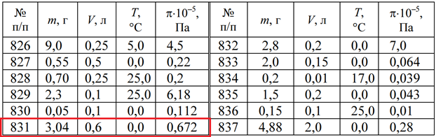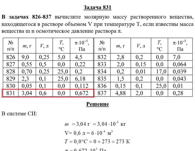 Задача 831 - вычислите молярную массу растворенного вещества, находящегося в растворе объемом V при температуре Т, если известны масса вещества m и осмотическое давление раствора π.