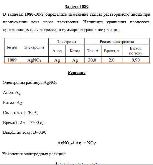 Для студентов по предмету ХимияЗадача 1089 - определите изменение массы растворимого анода при пропускании тока через электролит. Напишите уравнения процессов, протекающих на электрЗадача 1089 - определите изменение массы растворимого анода при пропускании тока через электролит. Напишите уравнения процессов, протекающих на электр