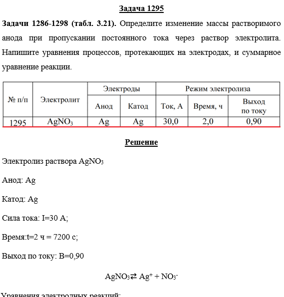 Задача 1295 - Определите изменение массы растворимого анода при пропускании постоянного тока через раствор электролита. На-пишите уравнения процессов, протекающих на электродах, и суммарное уравнение реакции.