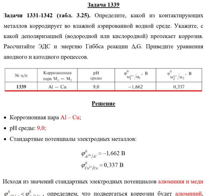 Главная » Учебные материалы » Химия » Решения задач » Несколько классов/семестров » Номер 1339 » Задача 1339 - Определите, какой из контактирующих металлов корродирует во влажной аэрированной водной среде. Укажите, с какой деполяризацией (водородной или кислородной) протекает коррозия. Рассчитайте ЭДС и энергию Гиббса реакции ΔrG. Приведите урав