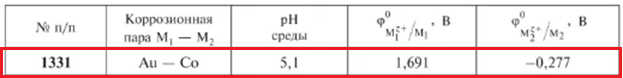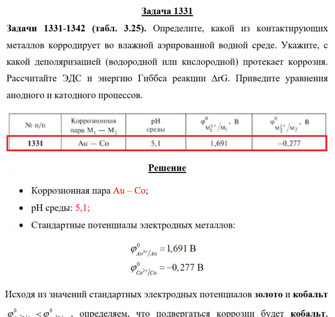 Задачи 1331-1342 (табл. 3.25). Определите, какой из контактирующих металлов корродирует во влажной аэрированной водной среде. Укажите, с какой деполяризацией (водородной или кислородной) протекает коррозия. Рассчитайте ЭДС и энергию Гиббса реакции ΔrG. Приведите уравнения анодного и катодного процессов..