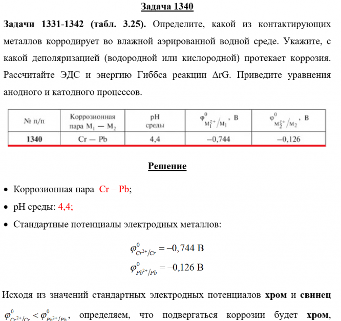 Задачи 1331-1342 (табл. 3.25). Определите, какой из контактирующих металлов корродирует во влажной аэрированной водной среде. Укажите, с какой деполяризацией (водородной или кислородной) протекает коррозия. Рассчитайте ЭДС и энергию Гиббса реакции ΔrG. Приведите уравнения анодного и катодного процессов..