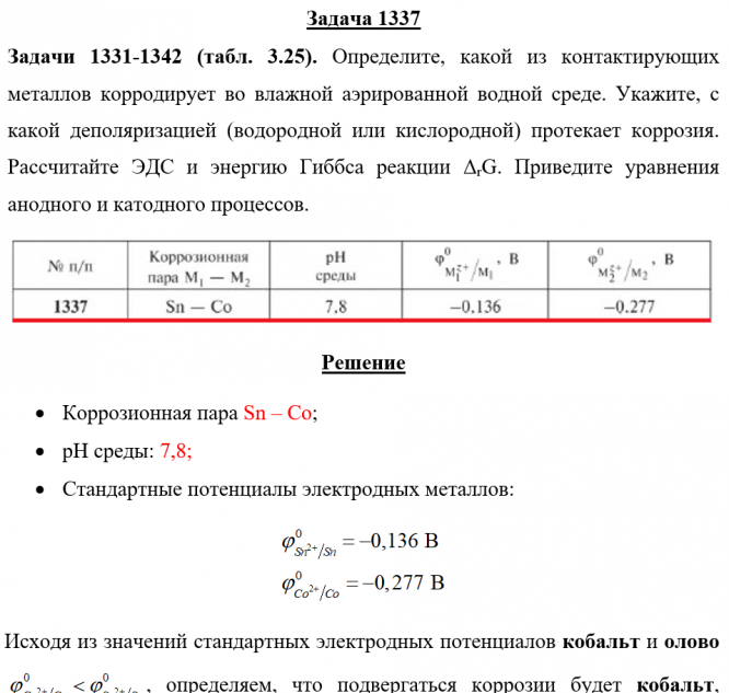 Задачи 1331-1342 (табл. 3.25). Определите, какой из контактирующих металлов корродирует во влажной аэрированной водной среде. Укажите, с какой деполяризацией (водородной или кислородной) протекает коррозия. Рассчитайте ЭДС и энергию Гиббса реакции ΔrG. Приведите уравнения анодного и катодного процессов..