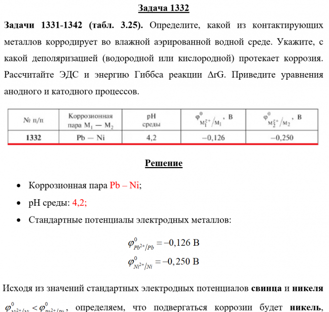 Задачи 1331-1342 (табл. 3.25). Определите, какой из контактирующих металлов корродирует во влажной аэрированной водной среде. Укажите, с какой деполяризацией (водородной или кислородной) протекает коррозия. Рассчитайте ЭДС и энергию Гиббса реакции ΔrG. Приведите уравнения анодного и катодного процессов..