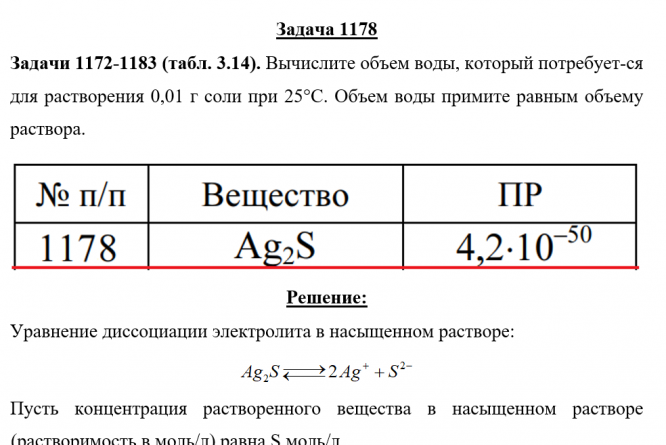 Задача 1178 - Вычислите объем воды, который потребует-ся для растворения 0,01 г соли при 25°С. Объем воды примите равным объему раствора.