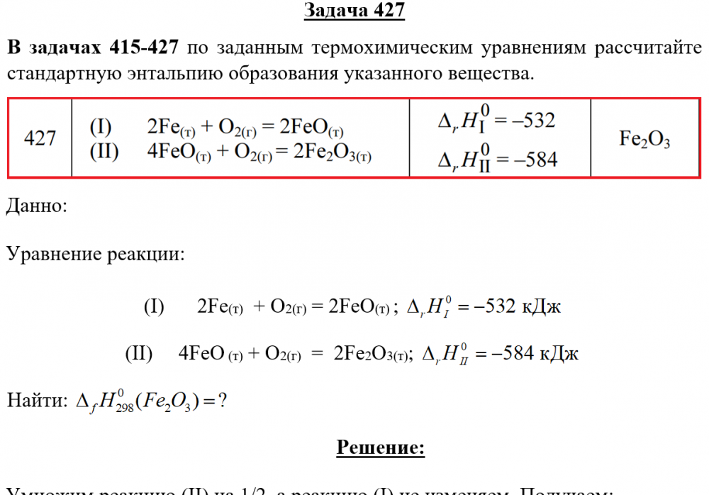 Задача 427: Задача 427 - По заданным термохимическим уравнениям рассчитайте стандартную энтальпию образования указанного вещества.