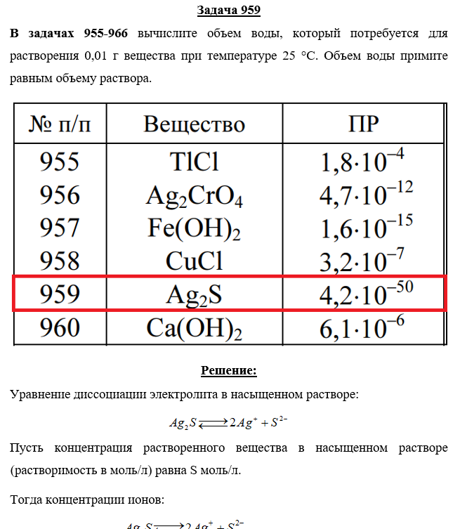 В задачах 955-966 вычислите объем воды, который потребуется для растворения 0,01 г вещества при температуре 25 °С. Объем воды примите равным объему раствора..